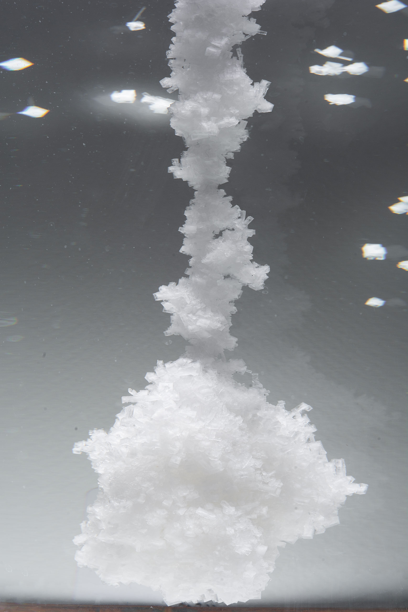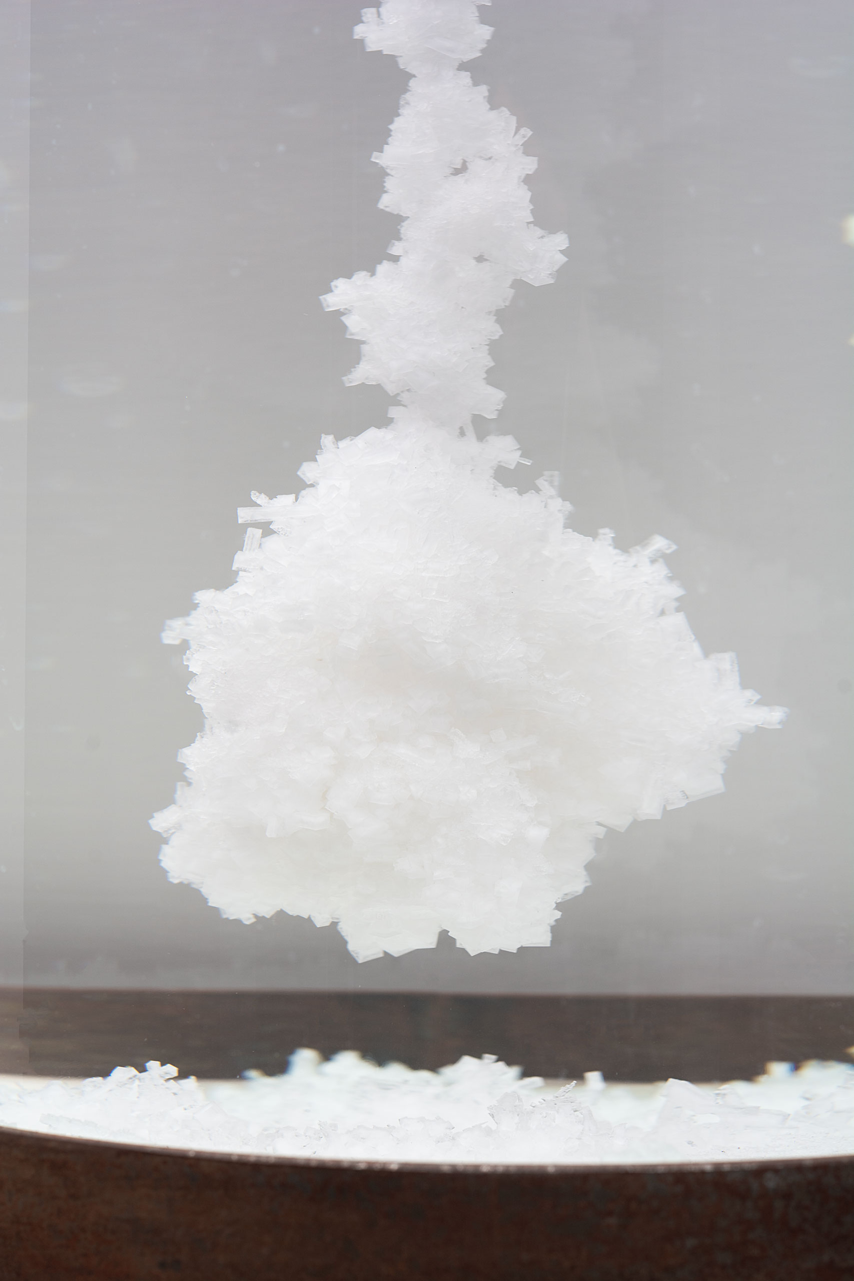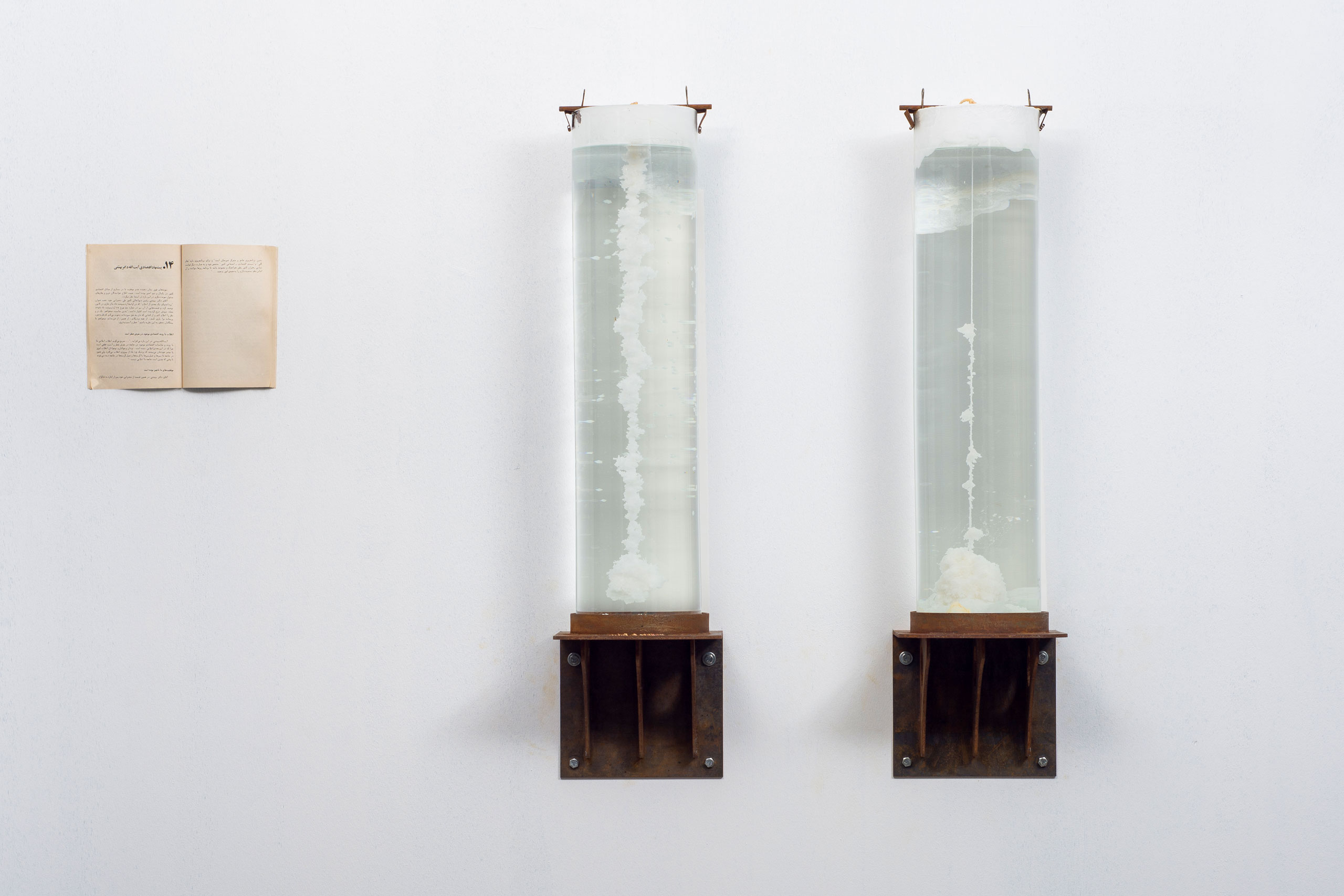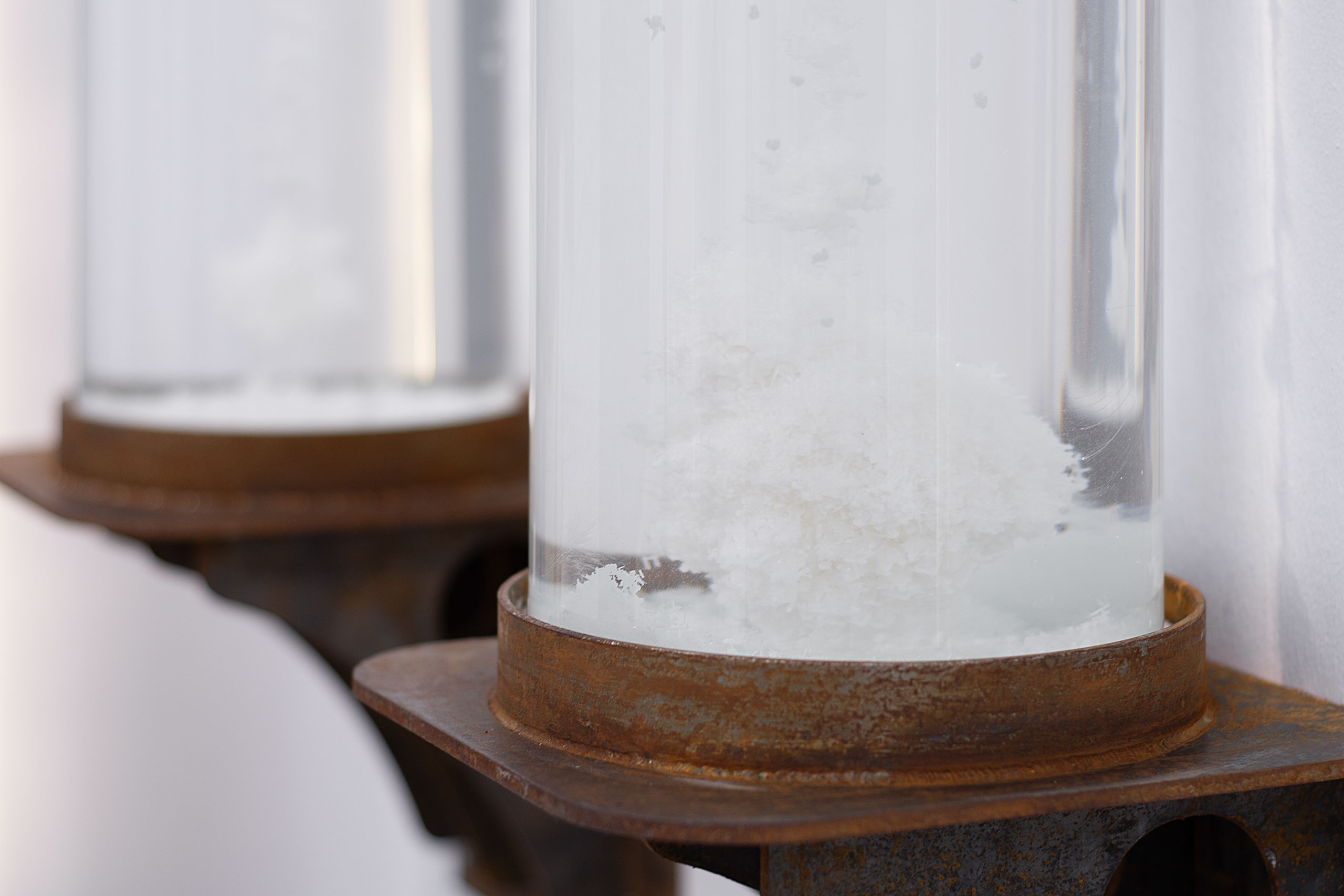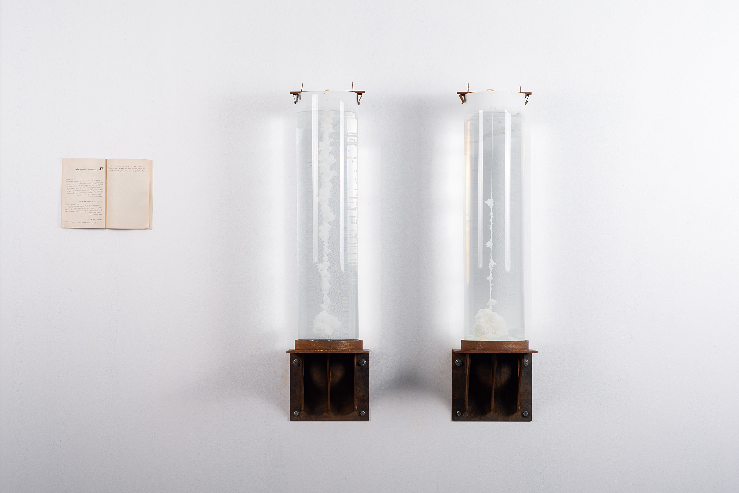 This is a collaborative project with Katayoun Karami as a part of a larger exhibition called “The Legacy of Oil and Ancestors” and as a part of a series called “Greedy”. The medium consisted of two glass cylinders that contained condensed saline water in which rock salt was formed and dissolved. As in one of the cylinders rock salt was being formed, the reverse was happening in the adjacent cylinder.